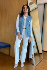 Layer this denim jacket over high-waisted Bottoms for a modern take on old-world sophistication.