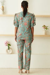 "With romantic ruffles sleeves in printed teal cotton satin, this blouse will be a favourite for seasons to come. This slim, flared pair looks perfectly polished when styled with a coordinated top."