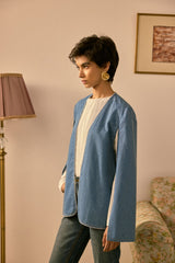 A versatile indigo-hued outerwear piece that provides a light layer of sophistication. Its fluid fit and minimal sparkle bridge the gap between casual ease and evening polish.