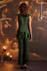 • A little texture brings a whole lot of style to this wear-with-anything top in glittery fabric with ruffle detailing in front.