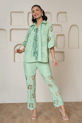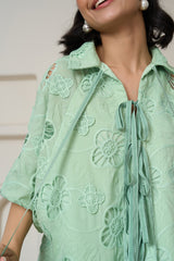 A fresh Sage green co-ord set featuring a delicate floral lace pattern. The set includes a short-sleeved top with a tie detail and matching pants, perfect for a stylish and breezy look.